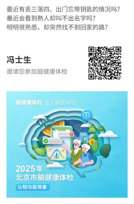 北京市脑健康体检(痴呆风险筛查)项目已开展多年。2025年,校医院在北京市卫生健康委员会统一部署下继续为辖区老年人提供脑健康体检(痴呆风险筛查)服务,进行痴呆风险筛查与脑健康管理、个性化认知康复训练指导服务及随访干预工作。(筛查完成后截图保存可到校医院急诊护士站领取上级发放的精美礼品一份,发完为止)